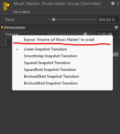 In order to be able to manipulate Audio Mixers from script, we first need to expose our desired paramiter. First, we open the Audio mixer window by going to window > Audio > Audio Mixer